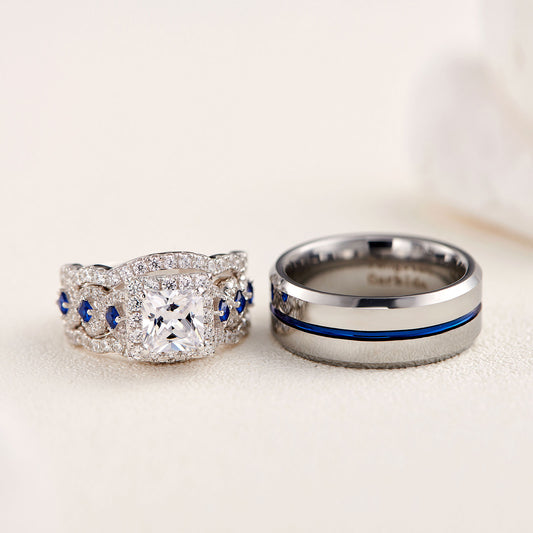 Newshe Wedding Rings Set for Him and Her Women Mens Tungsten Bands Princess Cz 2.3Ct Sterling Silver Size 7-13