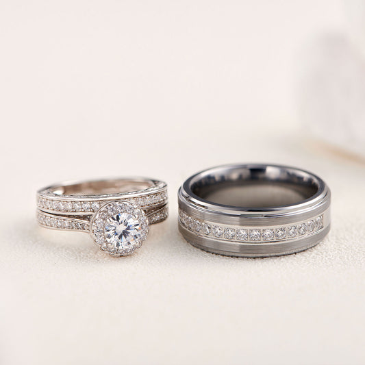 Newshe Wedding Rings Set for His and Hers Women Mens Tungsten Wedding Bands Round Cz 3Ct Sterling Silver