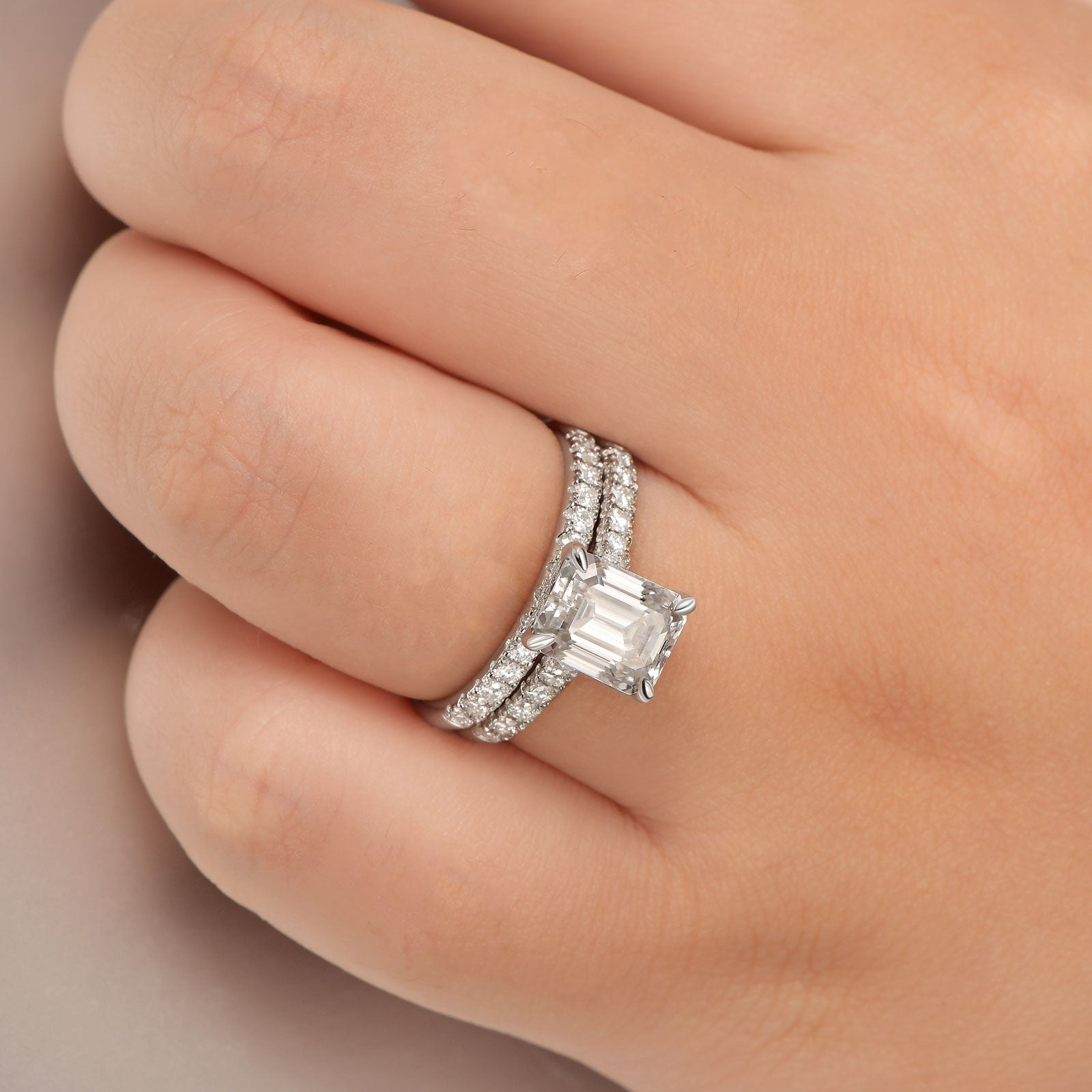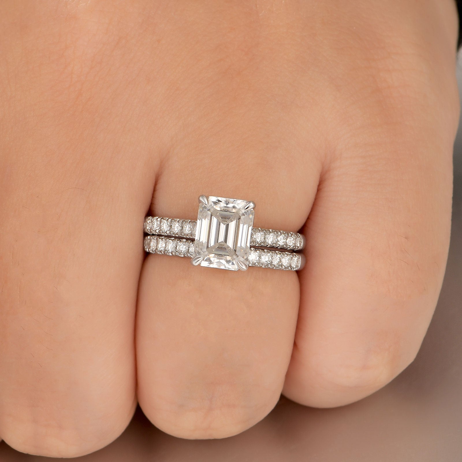- 【Timeless Moissanite Brilliance】 Main Stone Size:7x9mm.Emerald shape.Total stone weight:3.75cttw.Number of Stone:59 pcs. Embellish with moissanite wedding bands for women inlaid with 58 pcs D-colored VVS1 clarity round cut moissanite stones.