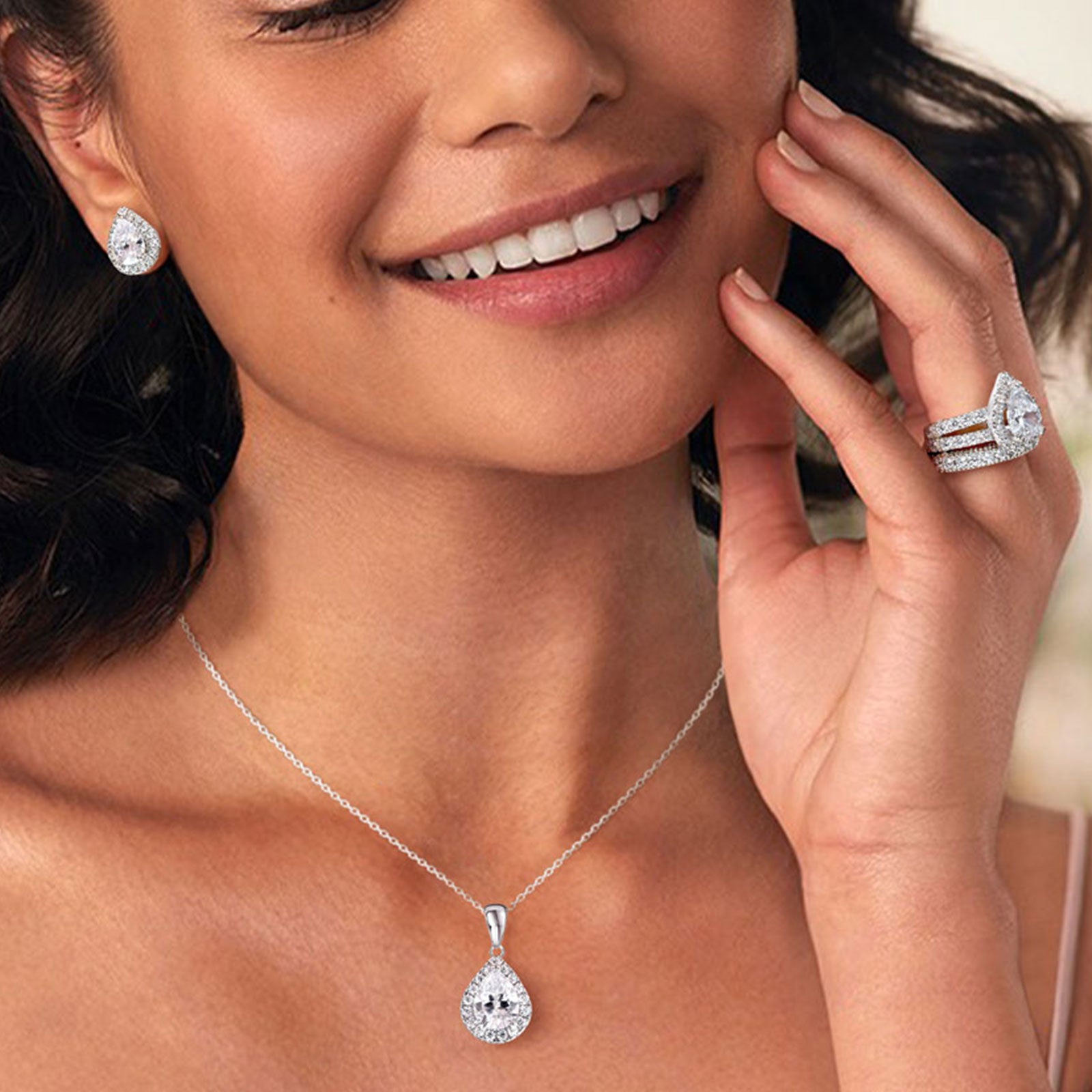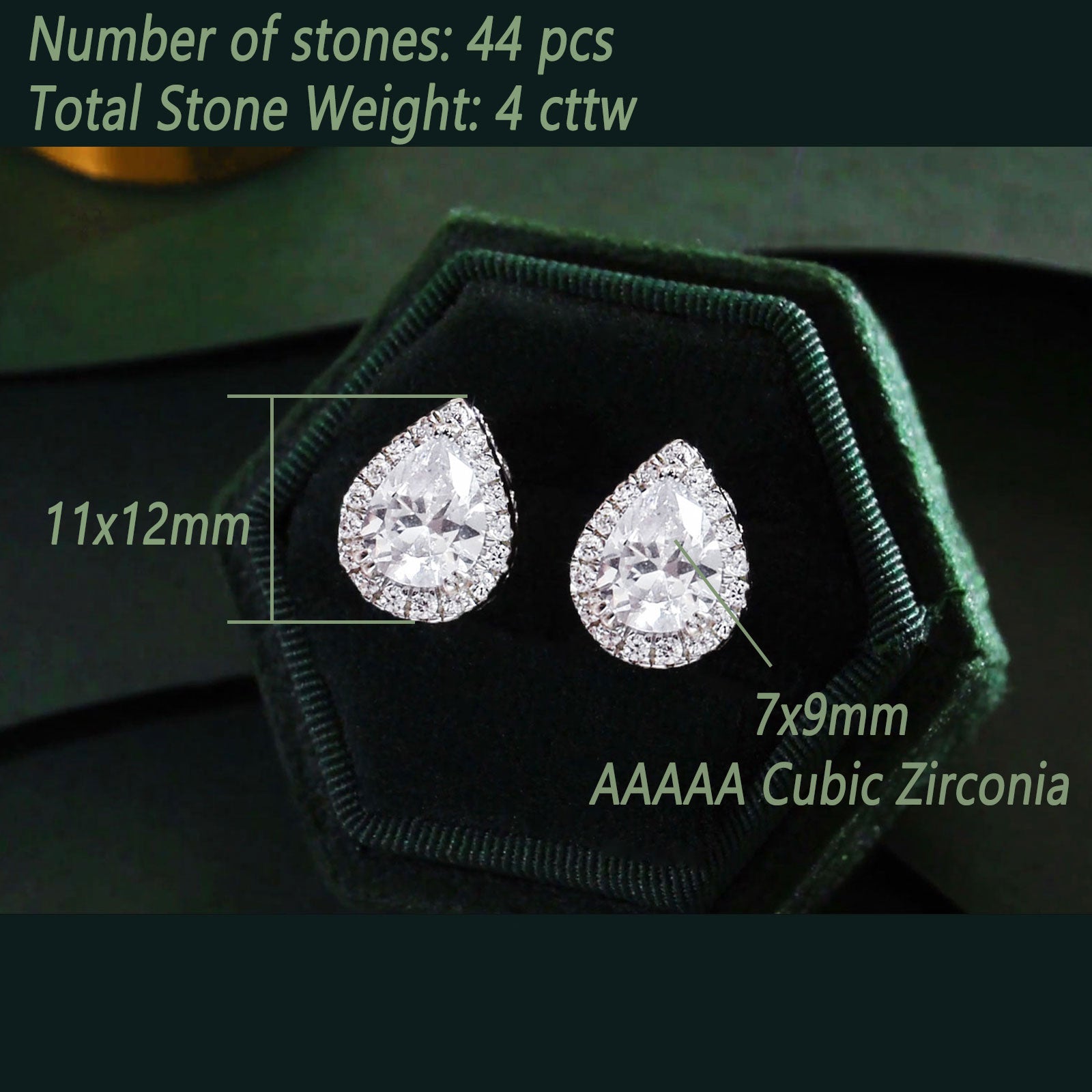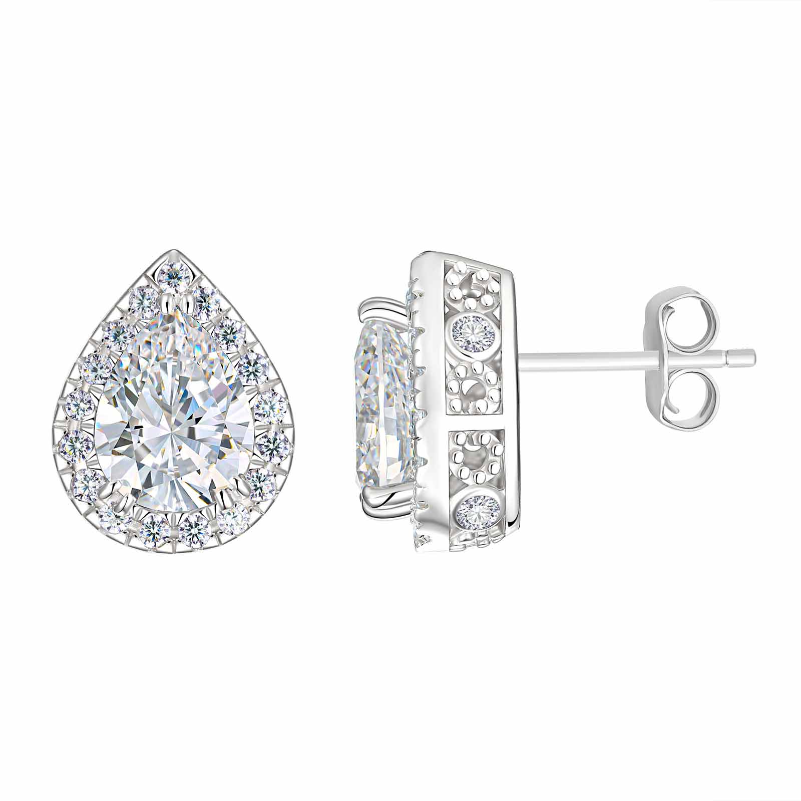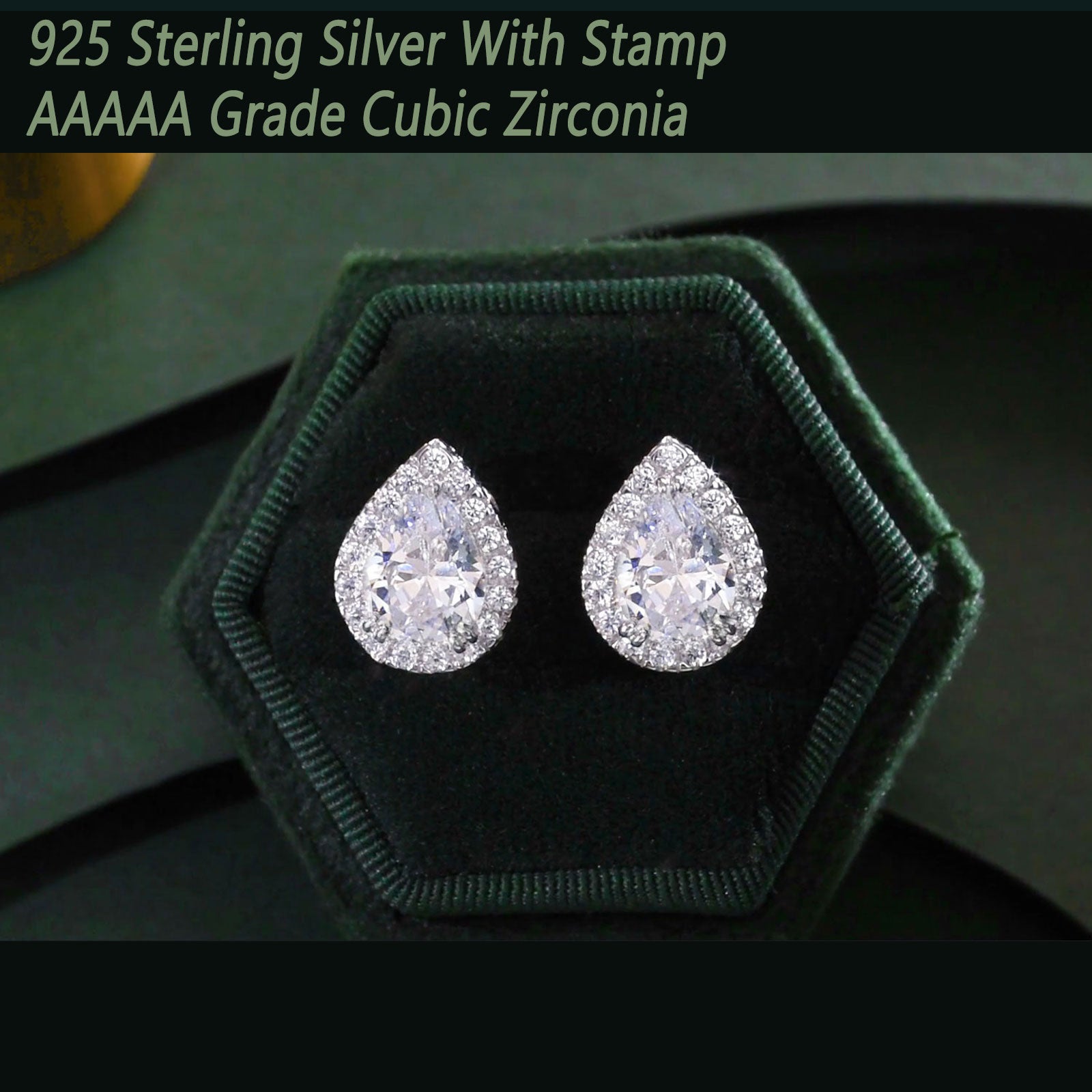 Newshe Jewellery affordable luxury studs earrings for women is crafted from SOLID 925 Sterling Silver and AAAAA grade cubic zirconia Cz.The earring features 1pcs 7x9mm pear cut AAAAA grade cubic zirconia center stone accented by 21pcs round cut AAAAA grade cubic zirconia center stone forming dazzling halo.A must have earring, great for everyday wear, party and formal occasions.