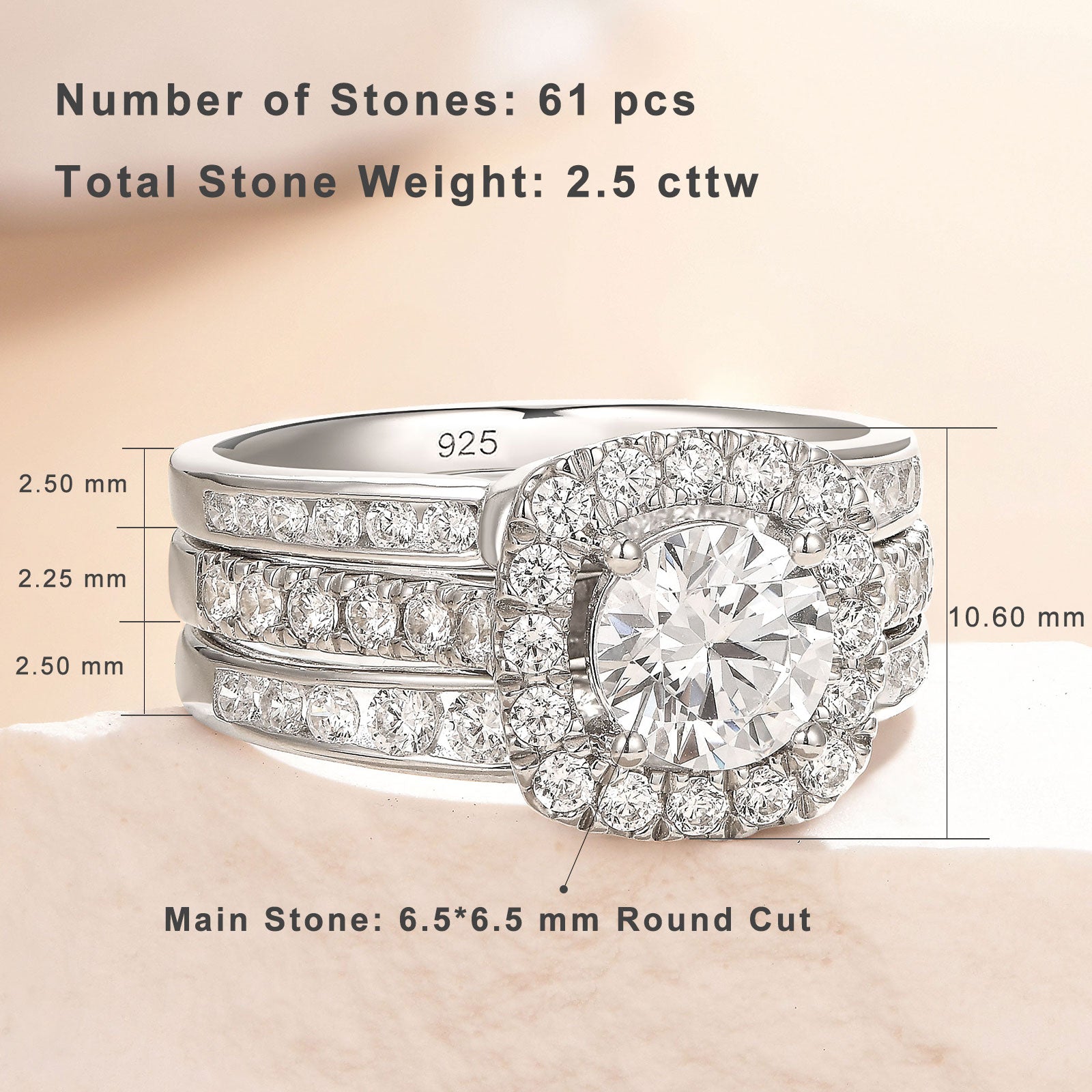 ♥Stunning Design♥ Main Stone Size: 6.5*6.5 mm, Total Stone Weight:2.5 CTTW. Experience luxury with Newshe's AAAAA Cubic Zirconia wedding ring sets for her, an elegant addition to your cz engagement rings for women collection. The Round Cut Halo design engagement ring set with wedding band for women offering the perfect blend of affordability and style.