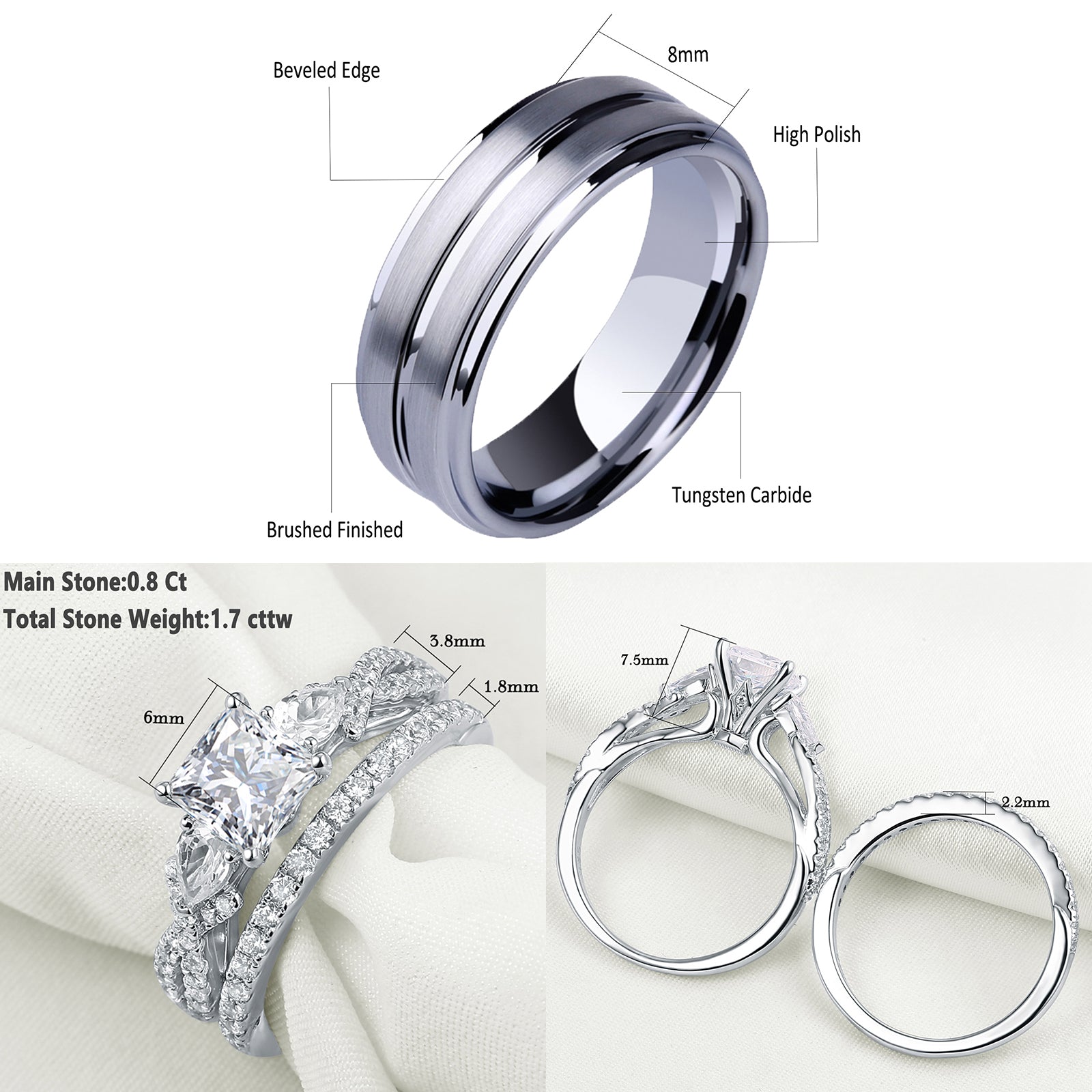 - Women's Ring: Main Stone Size:6*6mm,0.8ct.Princess cut cubic zirconia rings.This wedding rings set for him and her include sterling silver engagement ring, womens wedding bands and tungsten mens wedding bands. Women’s ring size available: 5 6 7 8 9 10.