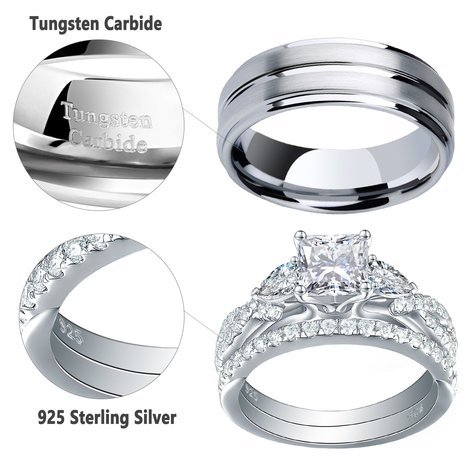Newshe Jewellery Beautiful petite 3 pieces AAAAA grade cubic zirconia bridal set engagement wedding rings for women and tungsten rings for men. The sterling silver wedding sets for women are crafted from 925 solid sterling silver and the wedding band for men is made of genuine tungsten. The bridal set for him and her features an sterling silver engagement ring with one princess cut 0.8 carats prong set center stone and two 5*3mm pear cut AAAAA cz surrounded by 38pcs white AAAAA cz down the sides. The matching wedding band feature 21pcs matching round AAAAA cz in a pave setting. The stones really catch the light and are very sparkly. The center stone has unbelievable depth and brilliance. Top quality stones display amazing enriched clarity just like real diamond. The tungsten wedding band for men is 8mm width. Great workmanship on high polished, brushed and matte finish show manliness and difference to people, comfort fit design high polish inner face bring you elegance and comfort.Matted brushed surface evenly distributed around the ring to have a move stylish look.
